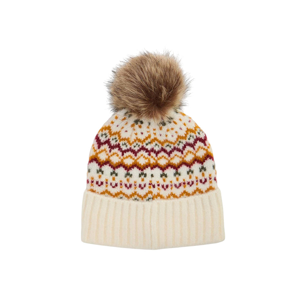 - This knitted hat comes in a stylish fair isle pattern with a contrasting ribbed turnup hem and a large faux-fur pom to finish