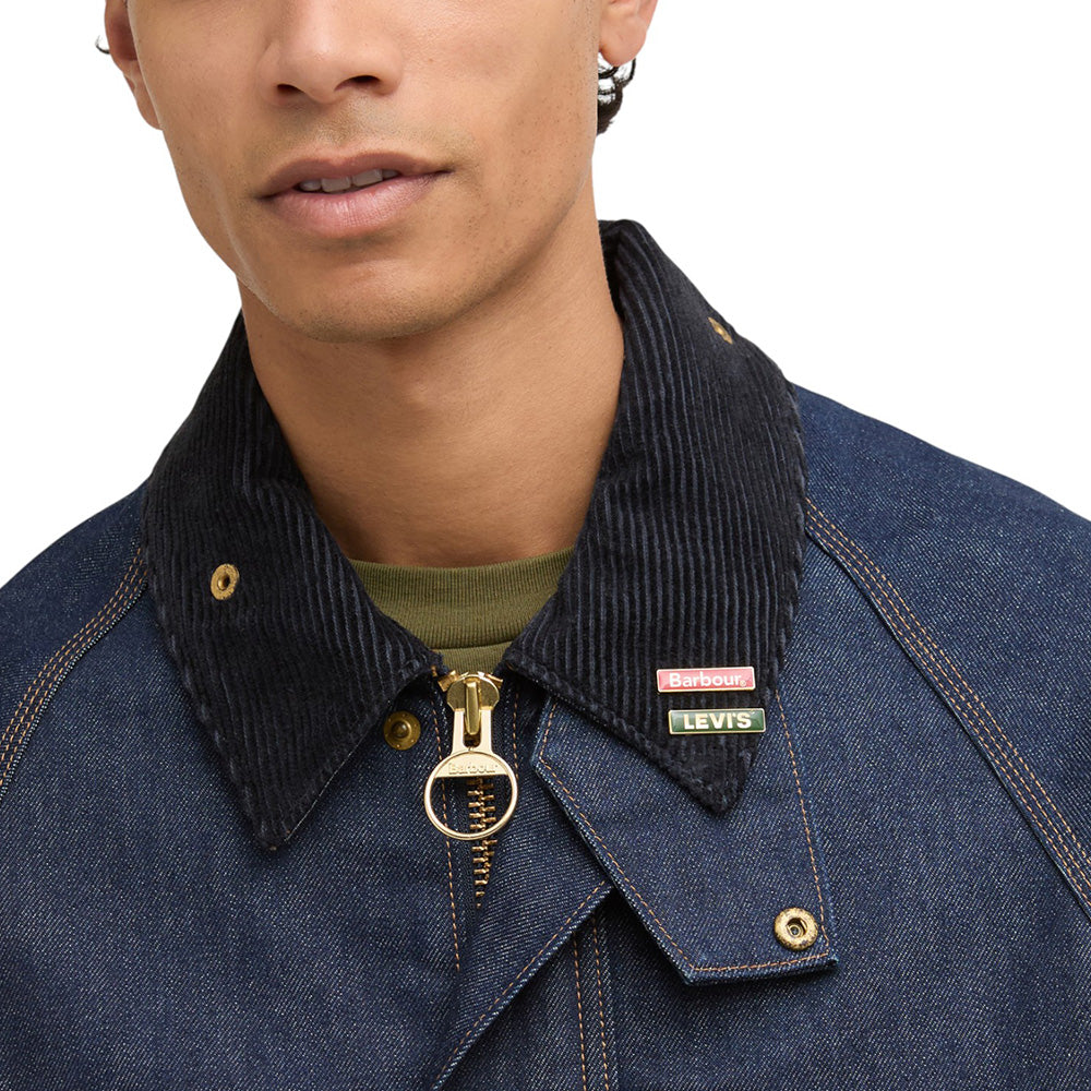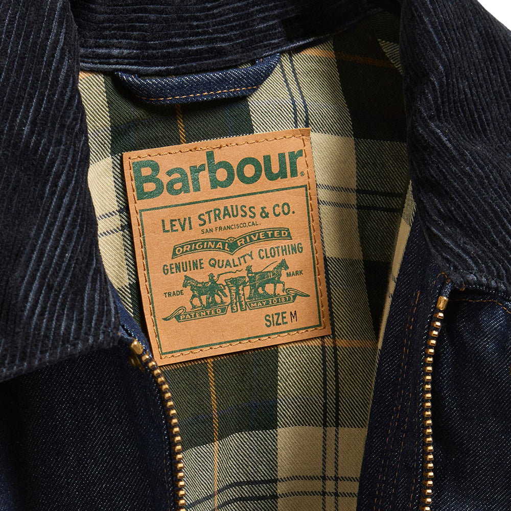 - This collaboration introduces signature Levi's details to this classic jacket with its tough denim and copper rivet fabrication and branded shank buttons paired with Barbour's signature handwarmer and bellow pockets, corduroy collar and ring-pull zip fastening, this style is the perfect balance of brand DNA