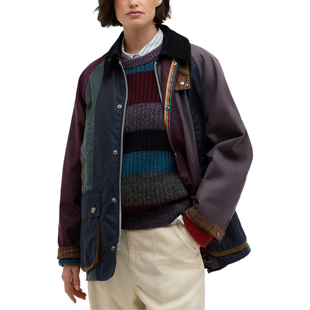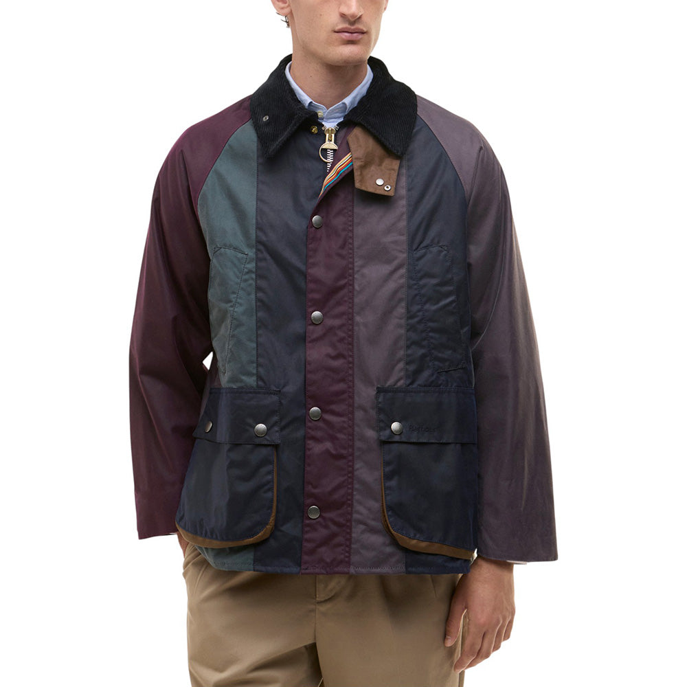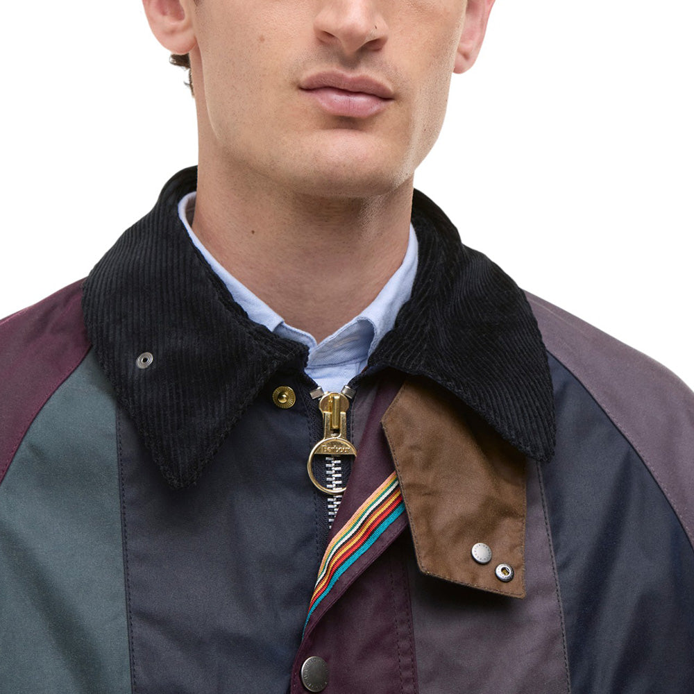 • Crafted from contrasting panels of 6oz waxed cotton inspired by Paul Smith's iconic stripes, this statement piece is an inventive reimagination of Barbour’s 1980 Bedale jacket.