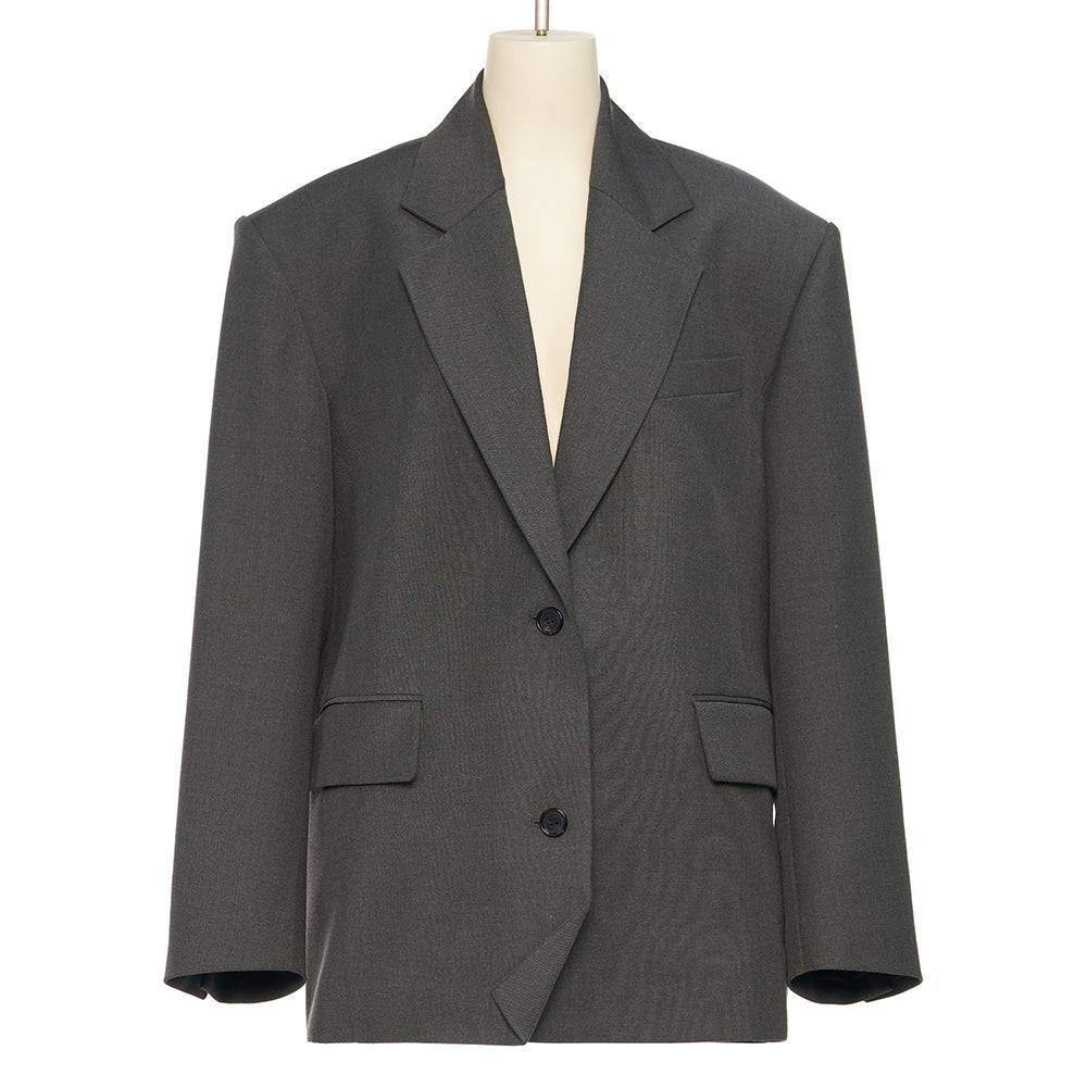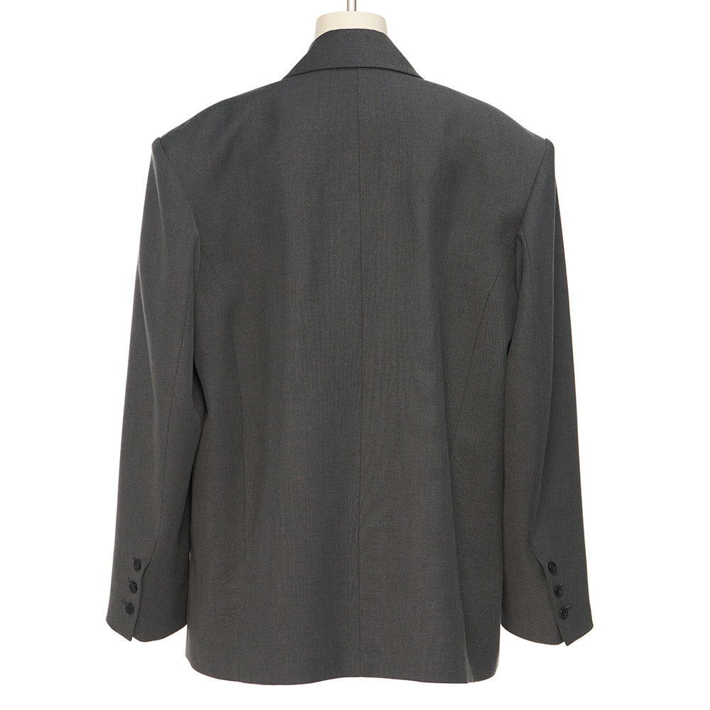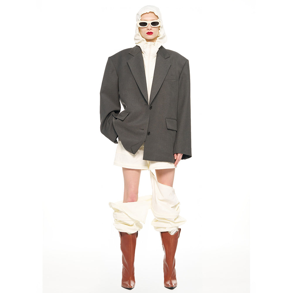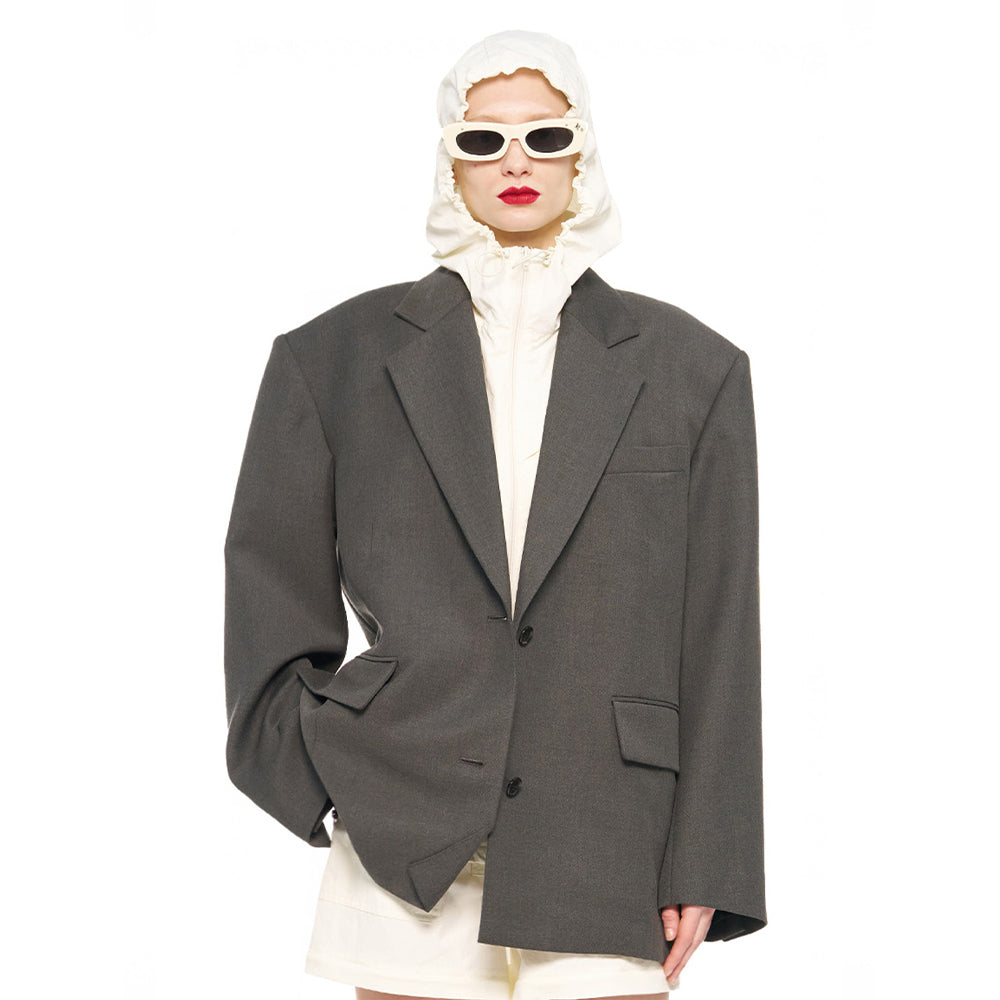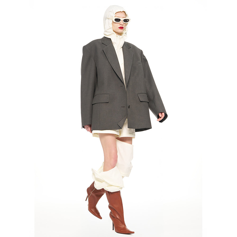 - Oversized jacket that falls below the shoulders and hips